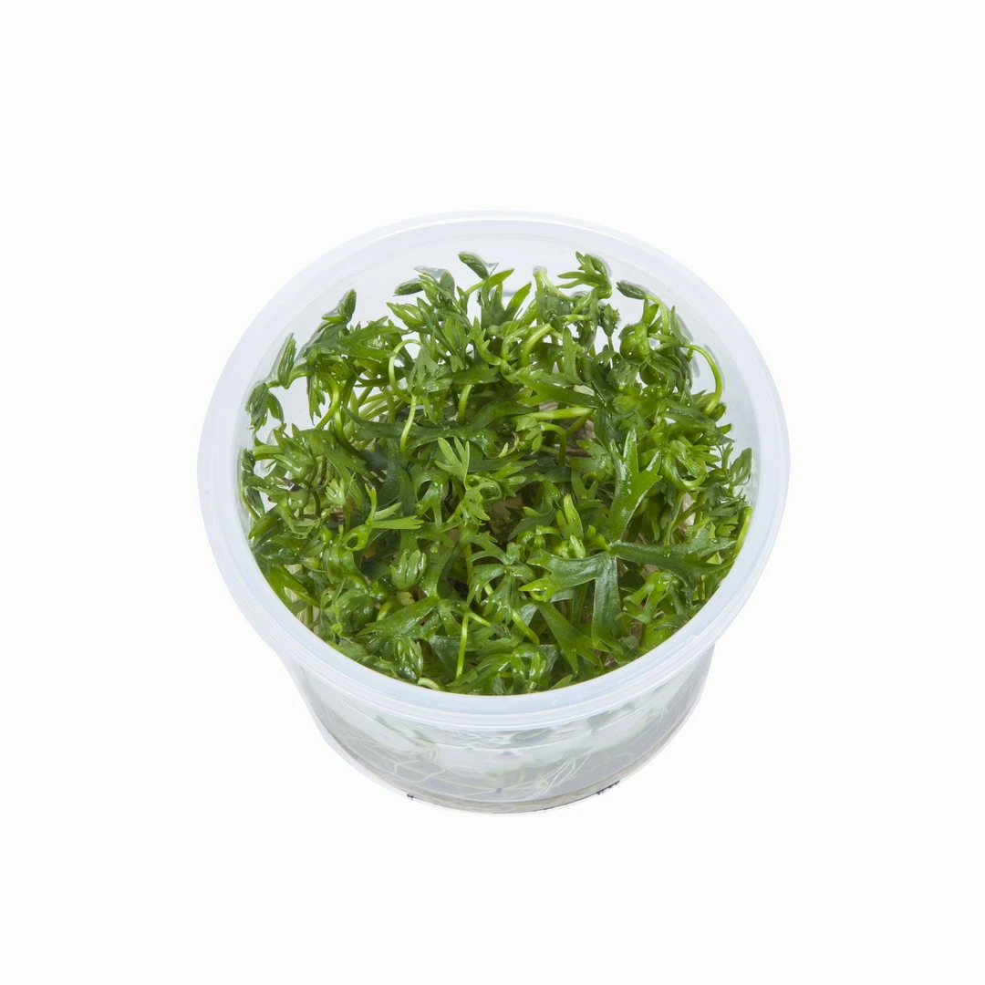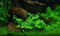 Fluss-Hahnenfuß kommt aus dem südöstlichen Australien. Wie die meisten Vordergrundpflanzen bildet Ranunculus inundatus, der auch unter dem Namen Ranunculus papulentus angeboten wird, auf dem Boden kriechende Sprosse, an deren Knoten aufrechte Blattstiele und die Wurzeln sitzen. Die handförmig gefiederten Blattspreiten mit den markant gegabelten Fiedern sind sehr auffällig und unverkennbar. Er benötigt viel Licht – unter schlechten Lichtbedingungen bildet er sehr lange Blattstiele und sieht dadurch nicht mehr so markant aus. Nach einer Eingewöhnungszeit wächst er schnell und bildet große Mengen niedrig wachsender Seitentriebe. Zusammen mit anderen Vordergrundpflanzen wie z.B. Cuba-Zwergperlenkraut kommt er besonders gut zur Geltung. Eine echte Bereicherung für jedes Nano-Becken.