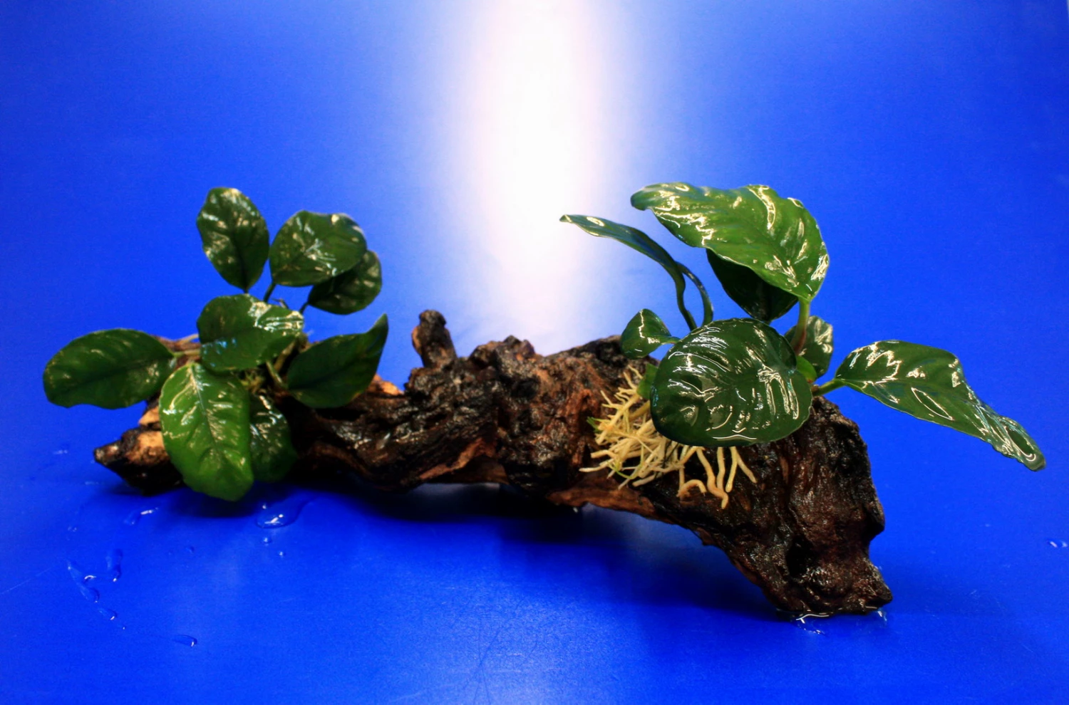 Die 2 Pflanzen sind mit einer Schnur auf der ca. 20-25 cm großen Wurzel aus südafrikanischem Eisenholz aufgebunden. Wenn die Pflanzen angewachsen sind, kann die Schnur entfernt werden. Die ideale Bepflanzung für Barschbecken und anderen pflanzenfressenden Besatz. Die Pflanze kann mit der Wurzel sehr schnell umgesetzt oder aus dem Aquarium entnommen werden. Also sehr praktisch beim Herausfangen von Tieren aus dem Aquarium – hervorragend geeignet für Zuchtbecken.
