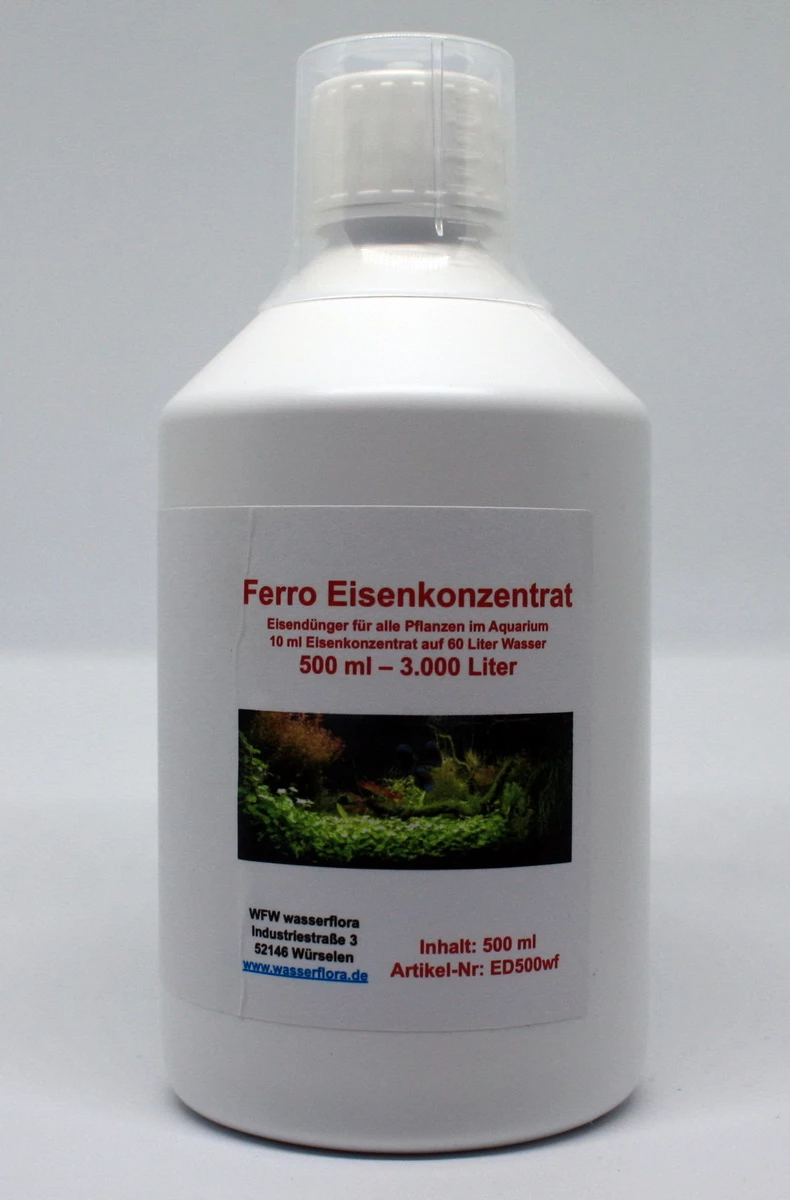 Eisenkonzentrat ist ein Eisendünger für alle Wasserpflanzen, die einen hohen Eisenbedarf haben. Dies sind besonders Pflanzen mit roten Blättern. Eisendünger verhindert Farb- und Wachstumsstörungen. Fehlt das notwendige Eisen im Aquarium werden die Blätter glasig, blass und gelb, und die Wasserpflanzen sind nicht mehr in der Lage, Sauerstoff zu produzieren. Das Eisen liegt im Eisendünger als zweiwertiges Eisen FE II in einer für Wasserpflanzen leicht aufnehmbaren, stabilisierten Form vor. Bei erhöhtem Eisenbedarf durch Rieselfilter, UV-Wasserklärer oder durch extrem starken Pflanzenwuchs, gefördert durch starke Beleuchtung (Starklichtbecken!) dient Eisenkonzentrat als notwendige Ergänzung zur Grunddüngung mit einem Eisen-Volldünger. So sind Ihre Pflanzen optimal versorgt. Eisenkonzentrat ist unbedenklich für Garnelen und andere Wirbellose.