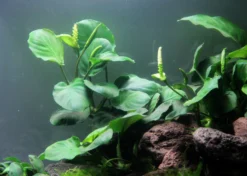 Anubias barteri ist die beliebteste Speerblatt Art mit unzähligen Blattformen. Die Sorte Coin Leaf ist durch gezielte Selektion vermehrt worden und bildet auffällige rund Blätter mit einem Durchmesser von 5-6 cm. Wie bei allen Anubias Arten ist auch diese Sorte anspruchslos und besonders pflegeleicht. Auch diese Sorte wächst am besten aufgebunden auf Wurzelholz oder Steinen. Beim direkten Einsetzen in den Bodengrund sollte das Rhizom deutlich sichtbar sein, da es ansonsten leicht zur Fäulnis kommen kann. Sie gedeiht unter allen Bedingungen und kommt aufgebunden auf einem Stein oder einer Wurzel sehr gut zur Geltung. Sie wird während sie anwächst einfach mit einer Nylonschnur fixiert. Sie blüht sehr häufig unter Wasser und wird wegen ihrer Bitterstoffe nicht von Barschen oder anderen pflanzenfressenden Fischen gefressen.