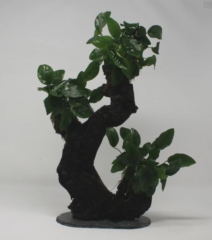 Der robuste, urwüchsige Stamm der MBUNA’s besteht aus einer afrikanischen Mopani-Wurzel. Zwergspeerblätter Anubias nana bilden die Blattkrone. Der Fuß des Urwaldbäumchens besteht aus einer standsicheren Schieferplatte, die auch im Bodengrund nicht verrottet.