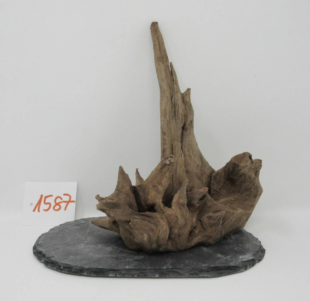 Die Wurzel ist für einen stabilen Stand auf einer Schieferplatte verschraubt. Die Schieferplatte kann bei Bedarf durch lösen der rostfreien Edelstahlschraube entfernt werden.